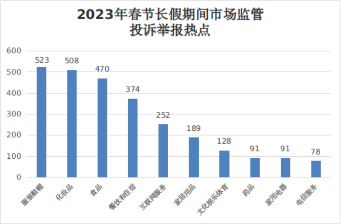 数据显示,春节长假期间(1月21日至27日),全市市场监管部门共接收处理消费投诉举报4607件(投诉3481件、举报1126件)。其中,服装鞋帽(523件)、化妆品(508件)、食品(470件)、餐饮和住宿服务(374件)、互联网服务(252件)等商品和服务的投诉举报量居前。