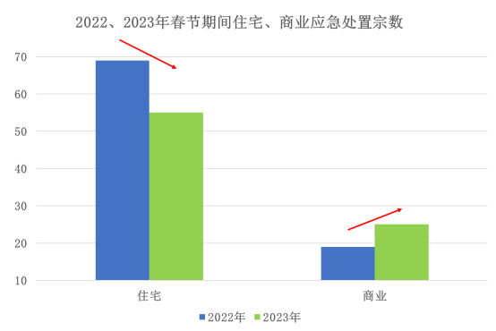 今年是国家优化调整防疫政策后的首个春节,市民出游增多。据统计,住宅场所电梯应急处置宗数同比2022年春节下降14宗,商业场所同比上升6宗。