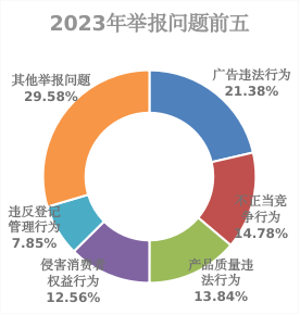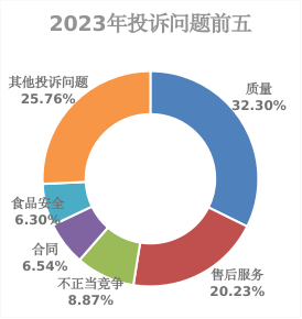 (二)从问题类别看,投诉主要涉及:质量(23.17万件)、售后服务(14.51万件)、不正当竞争(6.36万件)、合同(4.69万件)、食品安全(4.52万件)等五类问题,合计53.25万件,占投诉总量的74.24%。举报主要涉及:广告违法行为(6.58万件)、不正当竞争行为(4.55万件)、产品质量违法行为(4.26万件)、侵害消费者权益行为(3.87万件)和违反登记管理行为(2.42万件)等五类问题,合计21.68万件,占举报总量的70.41%。
