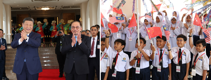 习近平乘车抵达总理官邸时,安瓦尔热情迎接。马来西亚青少年挥舞两国国旗,奏响欢快的鼓乐,跳起热情的民族舞蹈,热烈欢迎远道而来的贵宾。