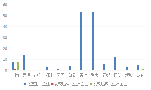 从各区域上看,2020 年第三季度各级监管机构共检查药品生产企业164家次,其中检查生产企业家次前三的区为番禺、黄埔、荔湾,检查次数达121家次,占全市的73.8%;发现违法的生产企业次数全市仅1 家次,由市局发现;发现违规的生产企业次数9 家次,分别由市局发现8家次、从化发现1家次;本季度没有完成整改的生产企业。具体详见附表1、2。