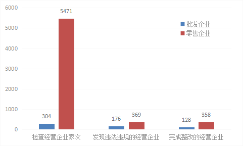 2020 年第三季度市区两级监管机构共检查批发企业304家次,发现违法违规的批发企业176 家次,完成整改128家次。市区两级监管机构共检查零售企业5471 家次,发现违法违规的零售企业369家次,完成整改358家次。详见附表3。