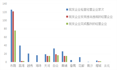 从各区域上看,2020 年第三季度市区两级监管机构共检查药品经营批发企业304 家次,其中检查企业次数靠前的区为荔湾、白云、黄埔,三个区检查次数共计99 家次,占全市的32.6%;发现违法违规企业176 家次,其中发现违法违规数靠前的区为白云、天河、黄埔,三个区发现违法违规数共计49 家次,占全市的27.8%;完成整改企业128 家次,其中完成整改企业数靠前的区为白云、天河、黄埔,三个区完成整改企业数共计47 家次,占全市的36.7%,具体详见附表4。