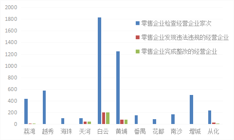 从各区域上看,2020 年第三季度市区两级监管机构共检查药品经营零售企业5471 家次,其中检查企业次数靠前的区为白云、黄埔、越秀,三个区检查次数共计3655 家次,占全市的66.8%;发现违法违规企业369家次,其中发现违法违规数靠前的区为白云、黄埔、天河,三个区发现违法违规数共计331 家次,占全市的89.7%;完成整改企业358家次,其中完成整改企业数靠前的区为白云、黄埔、天河,三个区完成整改企业数共计331家次,占全市的92.5%,具体详见附表5。